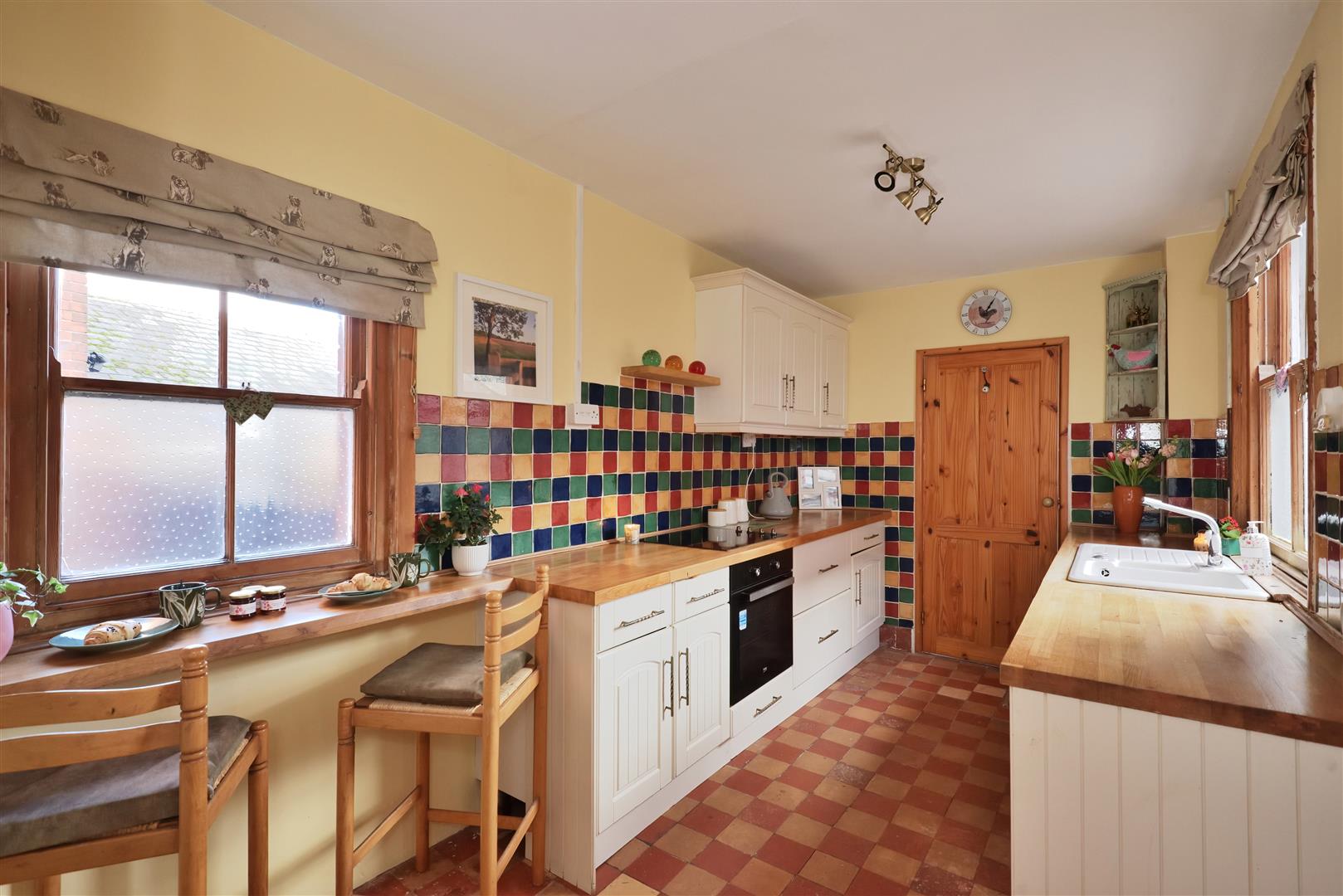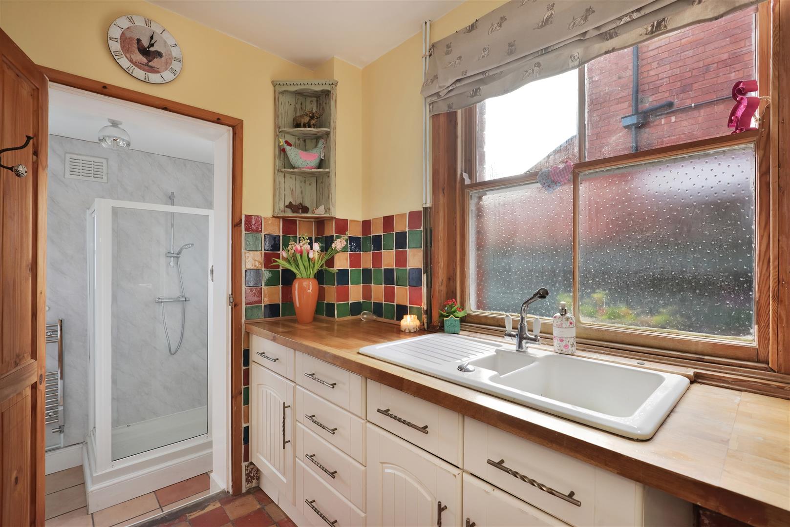 A doorway then leads to the well-equipped kitchen/breakfast room, which has sash windows on two sides, wooden working surfaces, an inset single drainer sink, built in Beko oven with induction hob above and floor and wall cupboards. A door then leads through to a very useful shower room with double shower cubicle, WC, ladder radiator, wall mounted Logic gas fired central heating boiler, windows on two sides and built in cupboards. There is then a rear porch with double glazed sliding door to gardens and emergency access from the cellar.