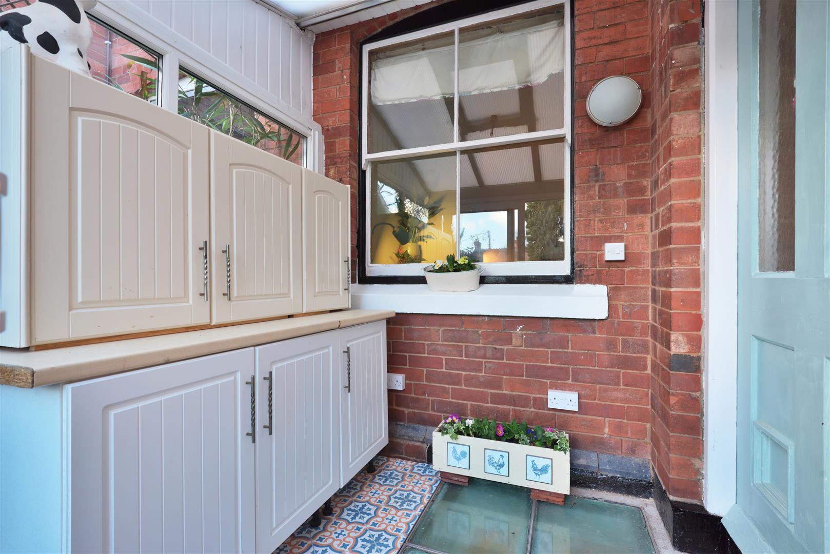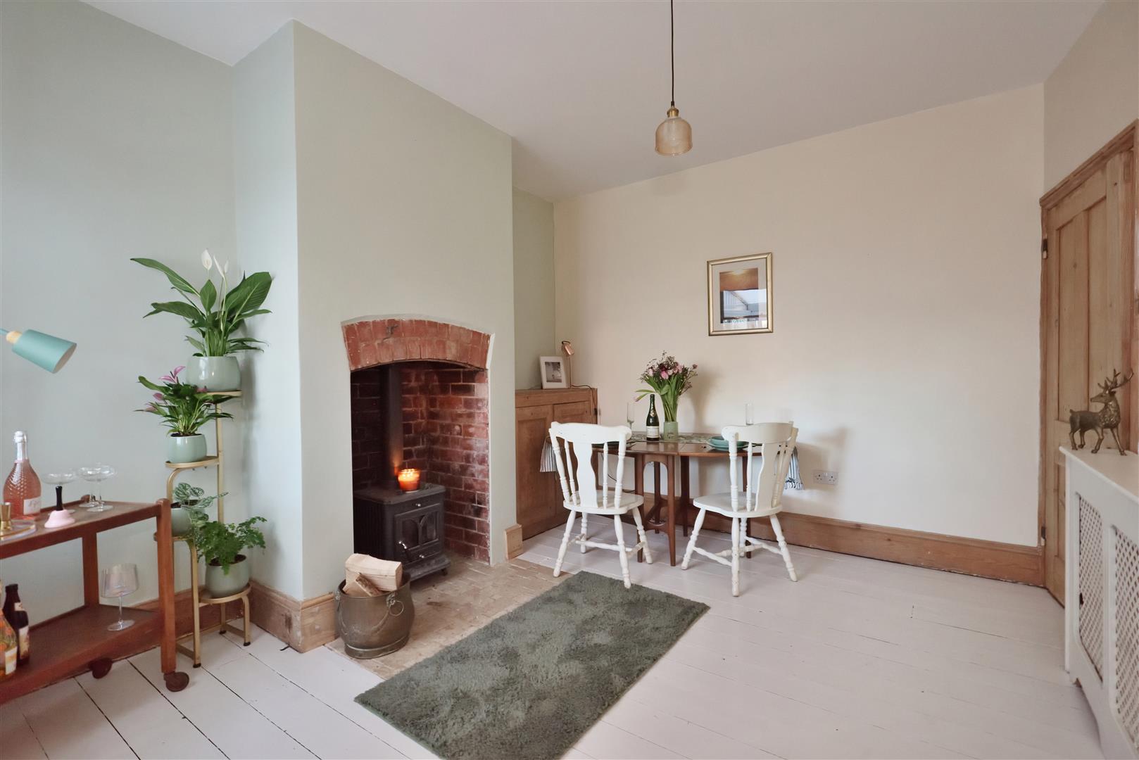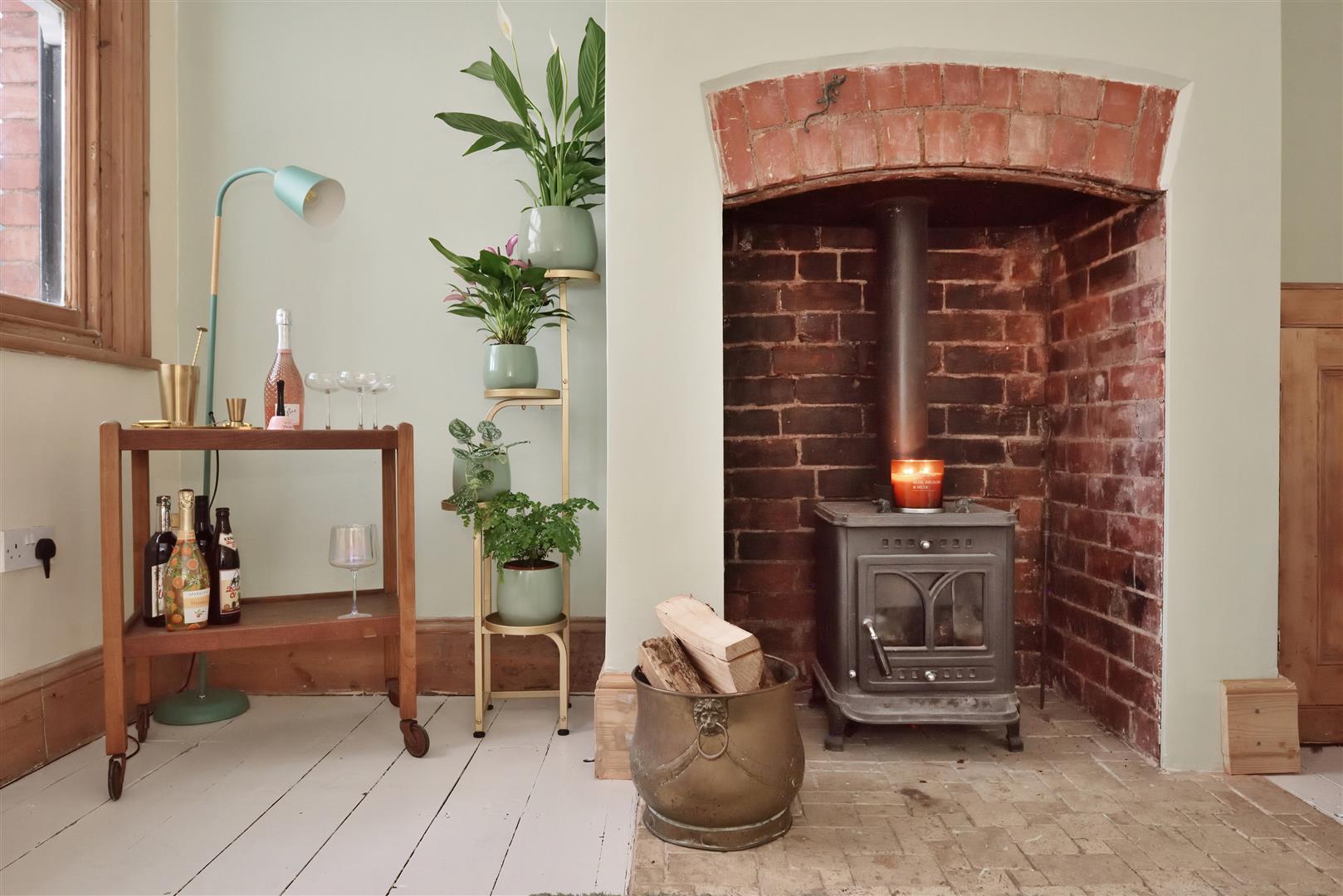 On arrival, a part glazed panelled front door leads into a welcoming entrance hall, with radiator and fielded panel doors leading off. The sitting room has a bay window to the front, fireplace, radiator, decorative arch and fitted carpet. Next door the living room has a painted wooden floor, brick fireplace with fitted wood burner with a fitted cupboard to one side, and a sash window looking through to rear porch.