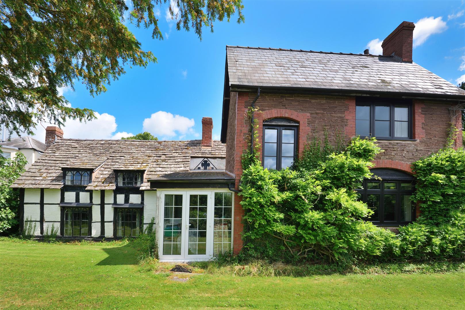 This fascinating property is available to the market for the first time in seventy five years and is an interesting mix of architectural styles, with a grade two listed brick and timber cottage with stone tiled roof, an adjoining Victorian brick and stone extension and some later 20th century additions at the rear. The house is set in well-established and spacious gardens which offer a good deal of privacy and adjoin the churchyard. Now in need of renovation and modernisation, the house offers plenty of living space which could be adapted to suit a large or extended family, subject of course to any necessary approval.